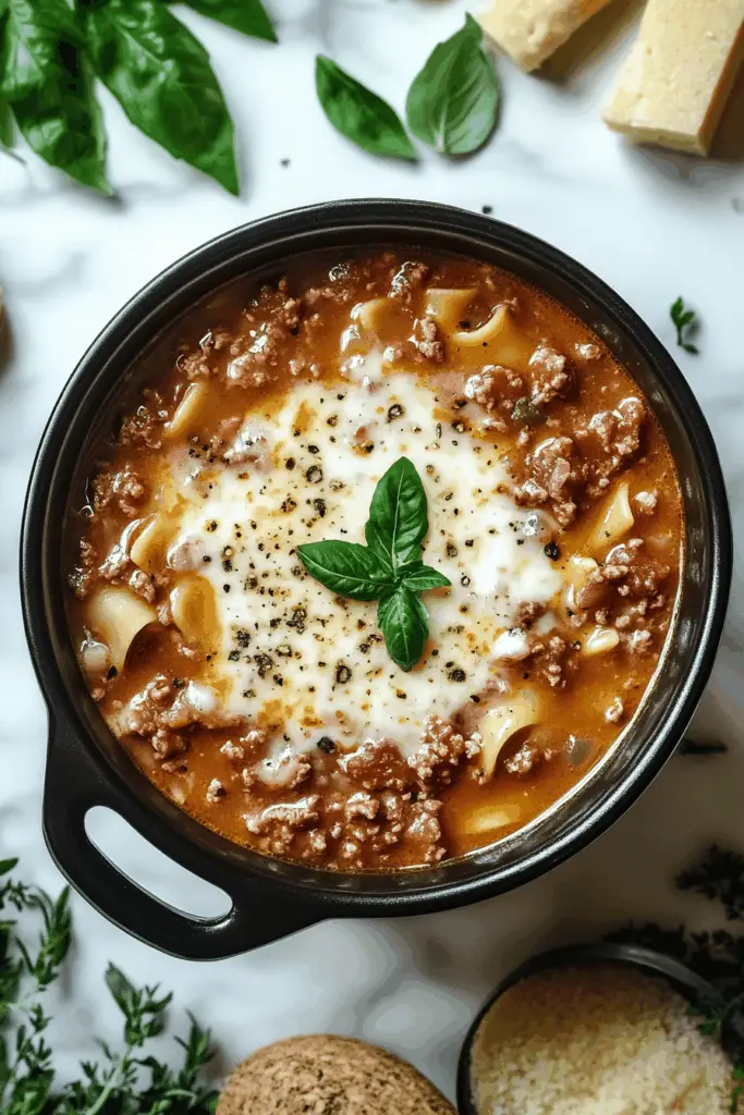 Creamy Alfredo Lasagna Soup: Dive into a comforting bowl of rich tomato broth swirled with creamy Alfredo sauce, hearty ground beef, tender lasagna noodles, and gooey melted cheese. A cozy twist on a classic favorite!