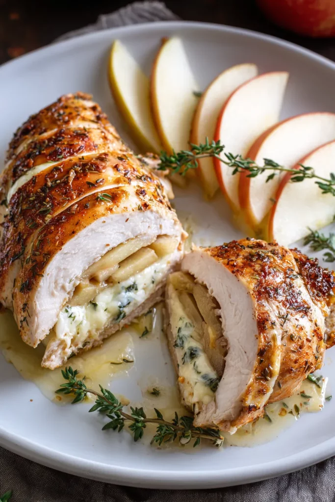 Stuff each chicken breast with a few slices of apple and Brie cheese. Use toothpicks or kitchen twine to secure the chicken breasts and keep the filling in.
