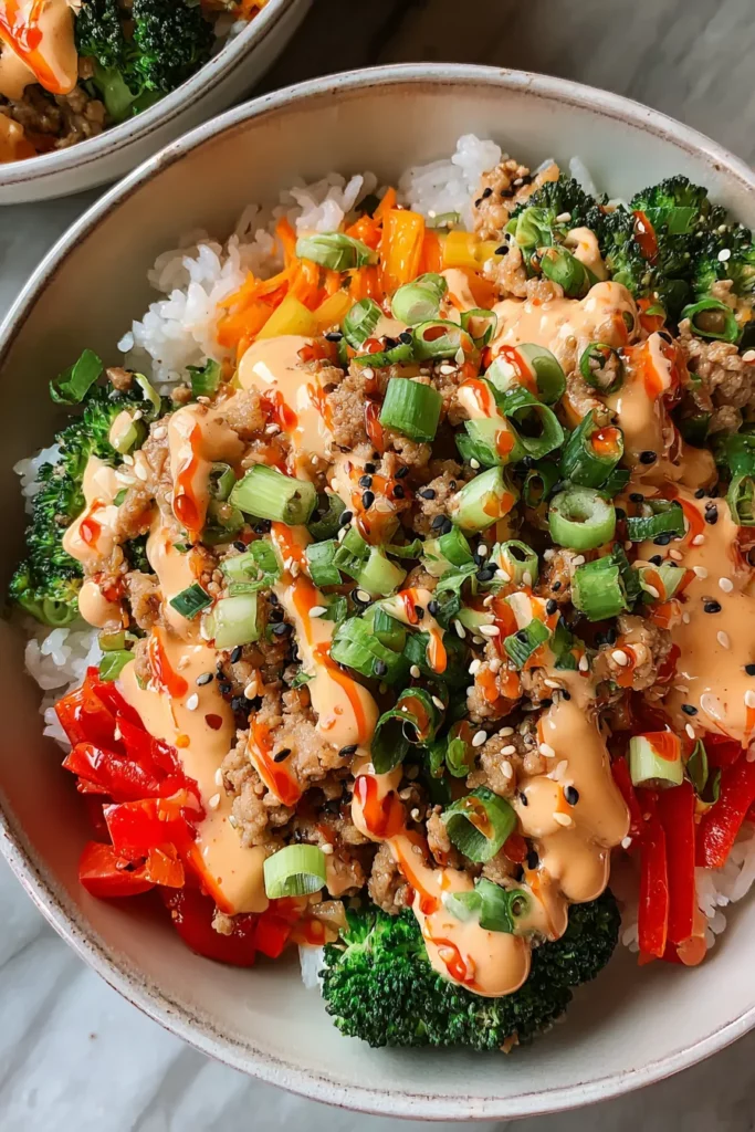 These Bang Bang Ground Turkey Rice Bowls combine savory turkey, crisp veggies, and a creamy spice sauce, served over fluffy jasmine rice for a balanced, delicious dish.