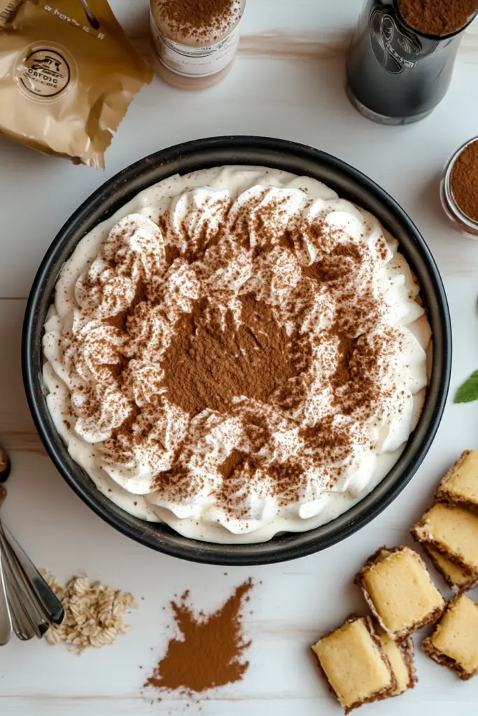 - STEP 13: Dust the top with cocoa powder using a fine-mesh sieve. The cocoa powder not only adds a finishing touch but also enhances the overall richness of the tiramisu.