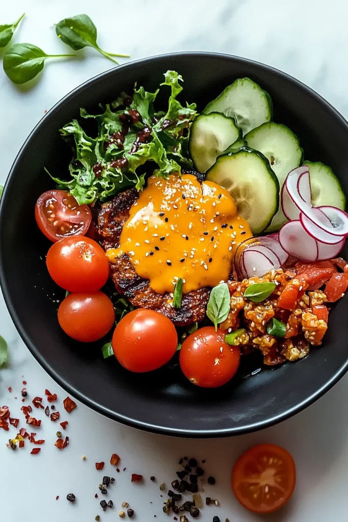 The beauty of a burger bowl is in its versatility—it’s the perfect canvas for experimenting with flavors and textures. You can layer it with your favorite toppings, from crispy bacon to creamy avocado, and each bite brings a delightful combination of fresh and savory elements. The key to making a burger bowl truly shine is the dressing. A tangy, zesty sauce, like a smoky chipotle mayo or a classic Thousand Island, can elevate the entire dish, tying all the ingredients together beautifully. As you build your bowl, think of it as creating a masterpiece: the juicy patty (or patty alternative) is the star, but it’s the supporting ingredients—the crunchy lettuce, juicy tomatoes, pickles, and a sprinkle of cheese—that complete the experience. And don’t forget the warm, toasted bun pieces scattered throughout—it’s the little things that make each bite feel like you’re enjoying a burger without the bun!