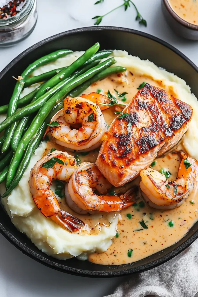 The rich, garlicky cream sauce draped over the Cajun shrimp and salmon is the star of this dish, offering a perfect balance of spice and creamy goodness. The shrimp, perfectly seasoned with a mix of Cajun spices, bursts with flavor, while the tender salmon provides a subtle, buttery contrast. Together, they create a mouthwatering harmony that’s hard to resist. As the sauce slowly melts into the buttery mashed potatoes, every bite feels like a little celebration, with the creamy, silky potatoes soaking up all the delicious flavors. And those green beans? They bring the dish together with a bit of crunch and freshness, cutting through the richness and adding a pop of color to the plate. It’s the kind of meal that’s both comforting and exciting—something you’ll want to make again and again. The best part? It’s one of those recipes that lets you show off your culinary skills while keeping the prep time manageable. Your guests will be so impressed, but only you will know how easy it was to pull off!