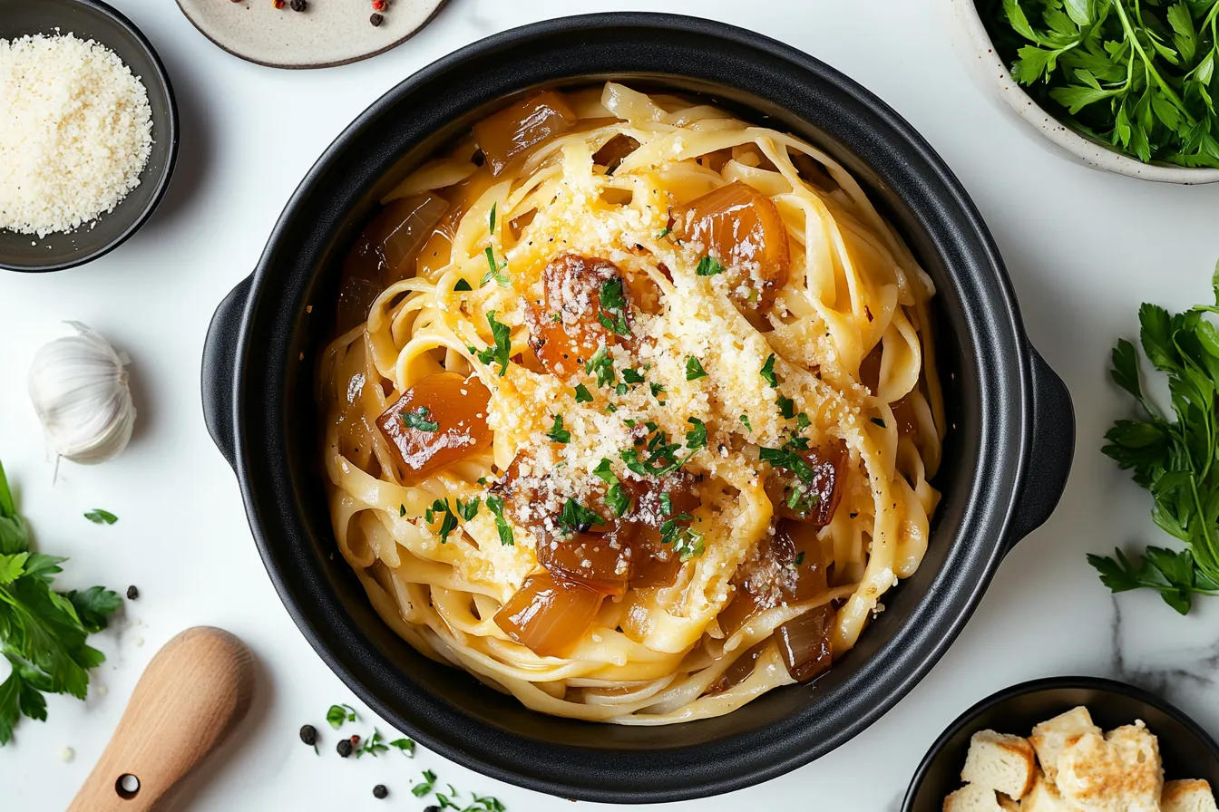 - STEP 17: Serve the pasta immediately, garnished with additional Parmesan cheese if desired. Enjoy the fruits of your labor — a plate of creamy, caramelized onion perfection!