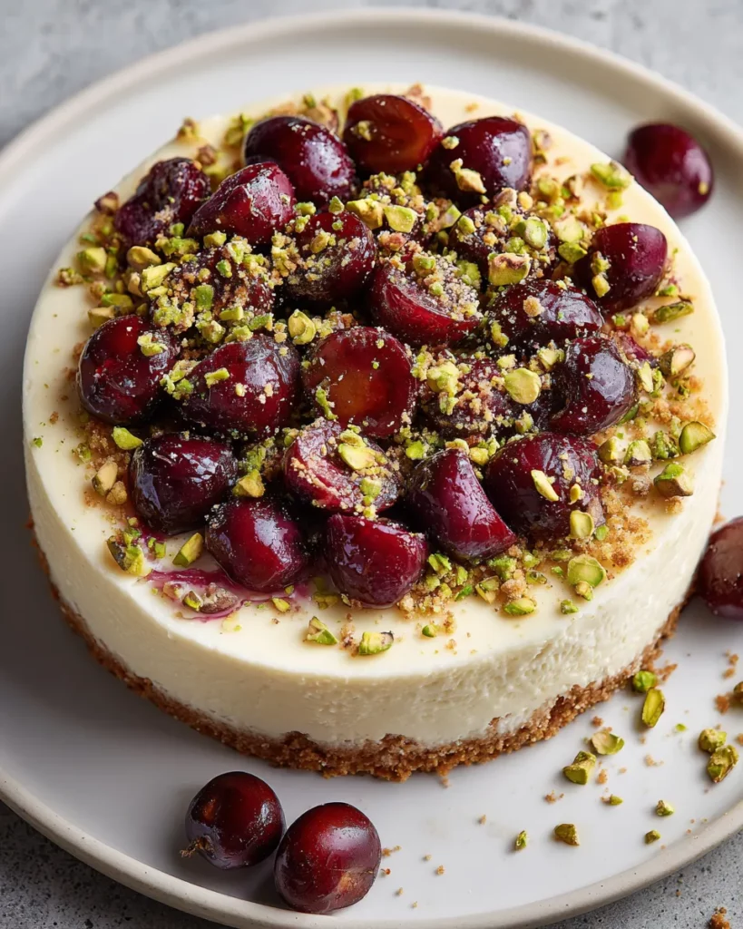 Once chilled, carefully remove the sides of the springform pan. Serve chilled, optionally garnished with more cherries and chopped pistachios.