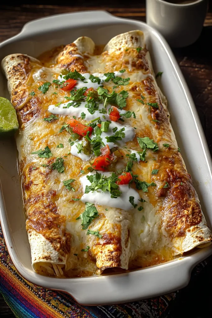 Experience the comforting flavors of tender shredded chicken wrapped in soft tortillas, smothered in a creamy, zesty sauce and melted cheese. Perfect for any weeknight dinner!