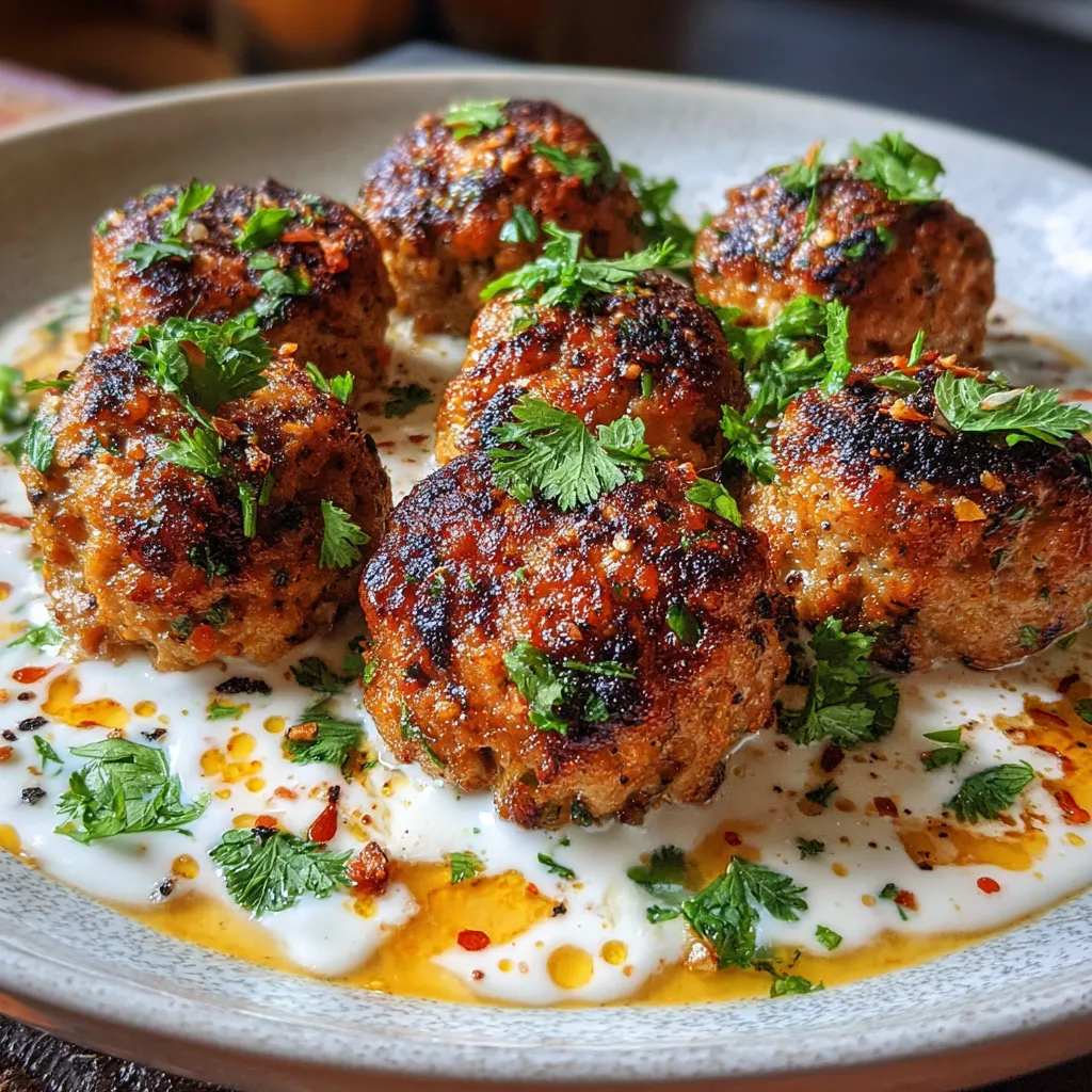 Tender chicken meatballs laced with cumin, coriander, and smoked paprika crisp up golden, then dunked into a creamy garlic yogurt spiked with lemon and fresh herbs for a flavor pop.