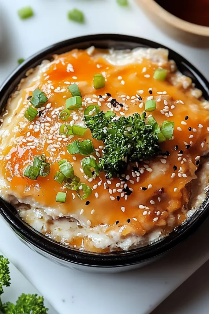 A sprinkle of sesame seeds on top adds a delightful crunch and a hint of nuttiness, giving the casserole an extra layer of texture and flavor.