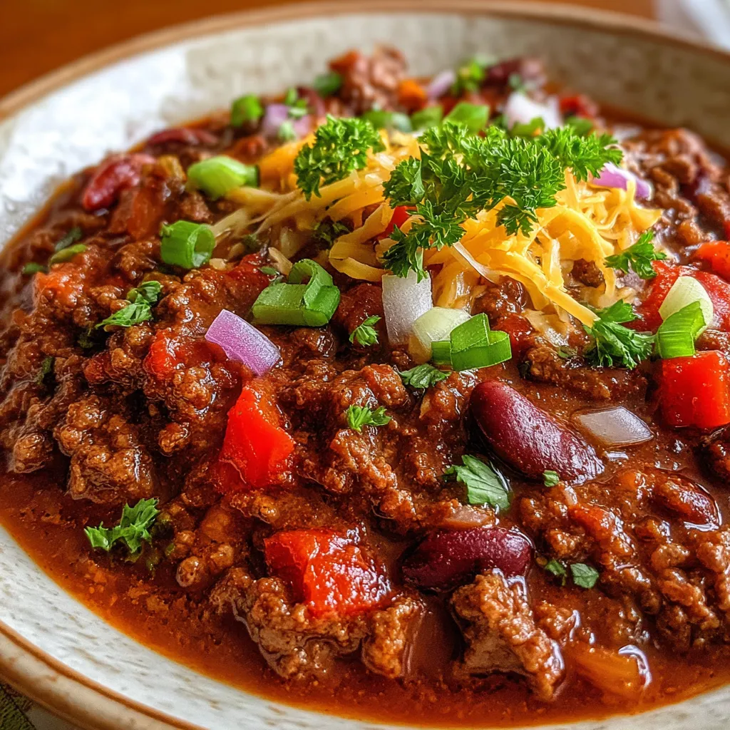 Thick, aromatic chili bubbling with tender beef, creamy beans, and colorful peppers, infused with smoky spices. Serve steaming hot with cheese, sour cream, or chopped onions for a comforting, flavorful meal.