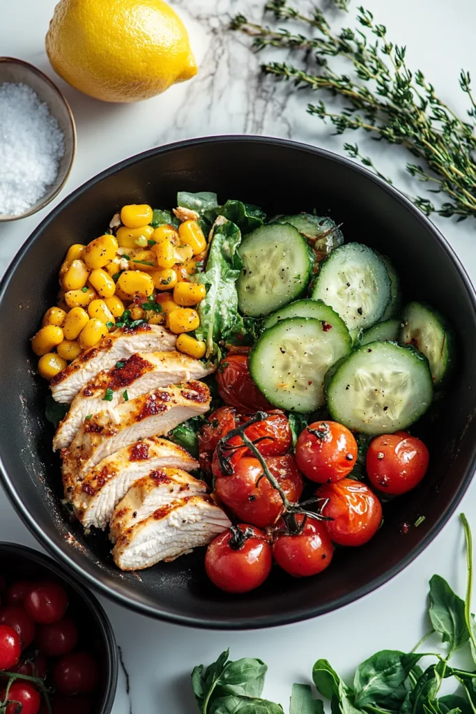 * Cherry tomatoes – These juicy, sweet bursts of flavor contrast the smokiness of the chicken and provide a fresh pop of color.