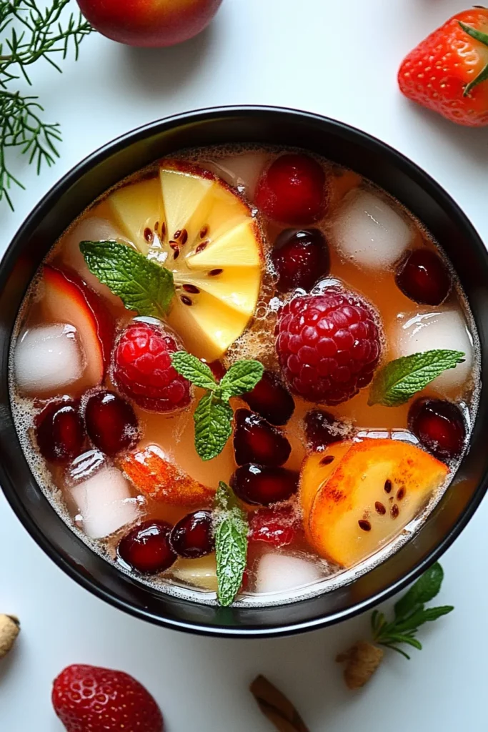 A few fresh mint leaves are more than just decorative—they add a hint of freshness and aroma to the drink. When you take a sip, the mint gives a cool, herbal note that elevates the tropical flavors.