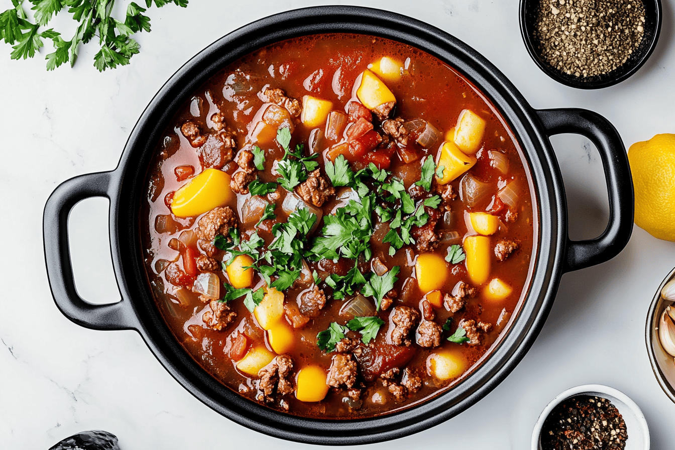 - This stew can be made in a slow cooker for a more convenient cooking method. Just brown the meat and sauté the onion and garlic before adding all ingredients to the slow cooker and cooking on low for 6-8 hours.