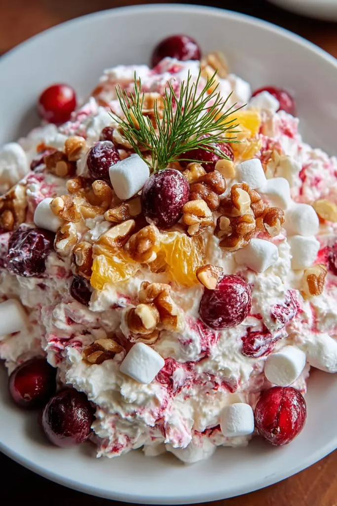 What makes this Fluff Salad stand out is its playful combination of textures: the zing of cranberries softened by a gentle simmer, the light-as-air whipped topping folded into smooth cream cheese, and the juicy sweetness of pineapple pieces dancing alongside pillowy mini marshmallows. Sprinkle in a handful of crunchy nuts for an optional nutty note, and you’ve got a recipe that’s begging for second helpings. I still remember the first time I blended these ingredients—my kitchen smelled like a holiday wonderland, and every family member leaned in for seconds. It’s simple, beginner-friendly, and delivers a show-stopping splash of color and flavor to any table.