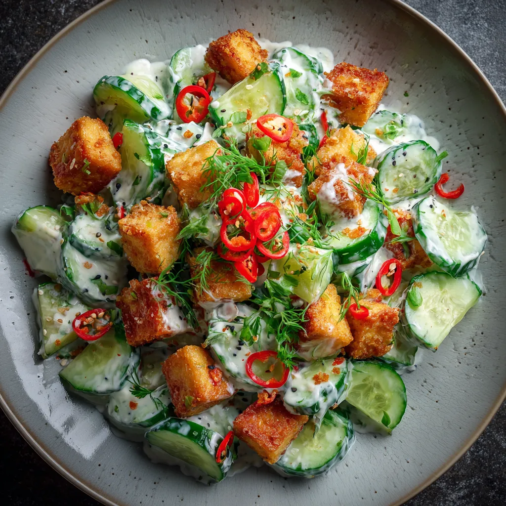 Tender cucumber slices swim in a tangy, creamy sesame-lime dressing, contrasted by the satisfying crunch of golden tofu. Bright herbs, roasted nuts, and a hint of chili come together for a lively, textural salad.