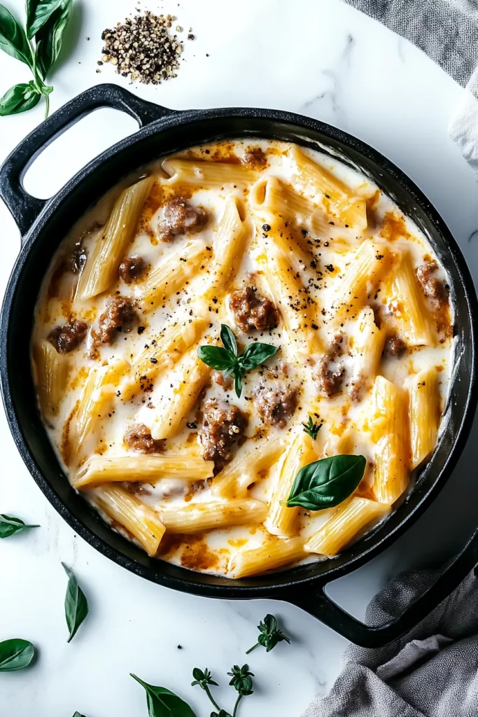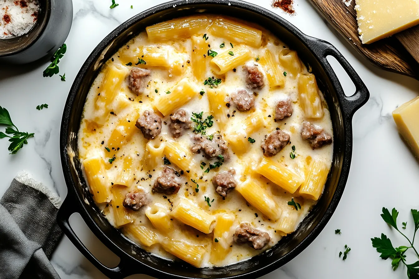 - STEP 20: Serve the creamy beef sausage Alfredo rigatoni immediately, garnished with extra Parmesan cheese if desired.