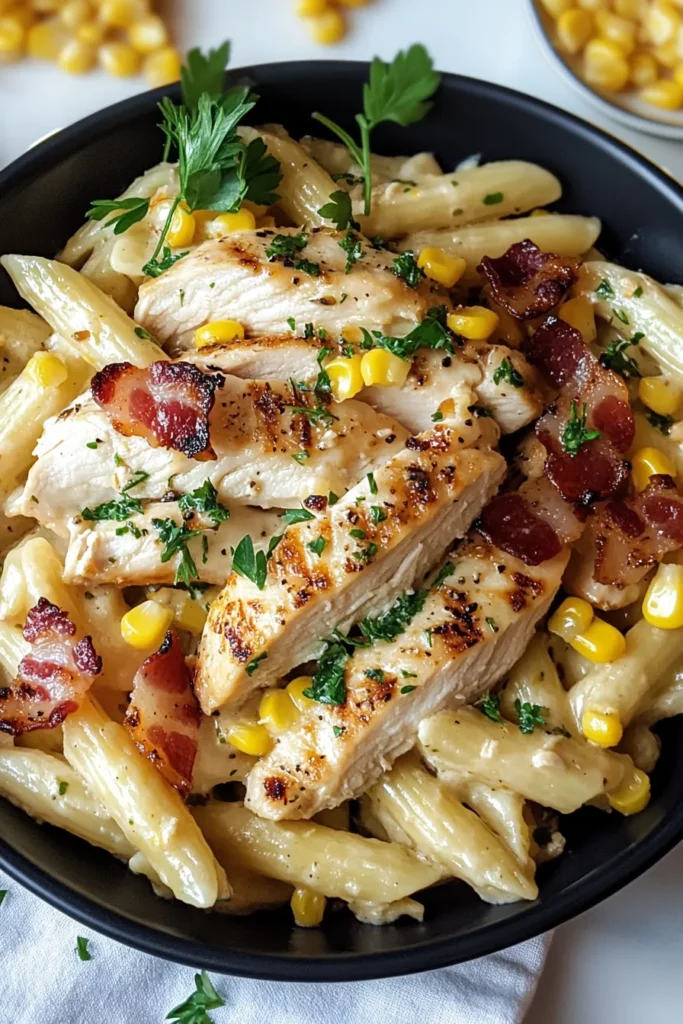 The combination of creamy chicken, sweet corn, and crispy bacon creates a symphony of flavors that work so well together in this pasta dish. The richness of the creamy sauce coats every bite, while the bursts of sweetness from the corn bring a delightful contrast. The bacon adds a perfect touch of smokiness and crunch that makes each mouthful a little more exciting. As the pasta soaks up the sauce, it becomes this comforting, savory dish that’s as satisfying as it is delicious. What I love most about this recipe is how easily it transforms a few simple ingredients into something truly special for dinner. The balance of textures—from the velvety sauce to the crispy bacon—keeps you coming back for more, and it’s just one of those meals you’ll crave on repeat.