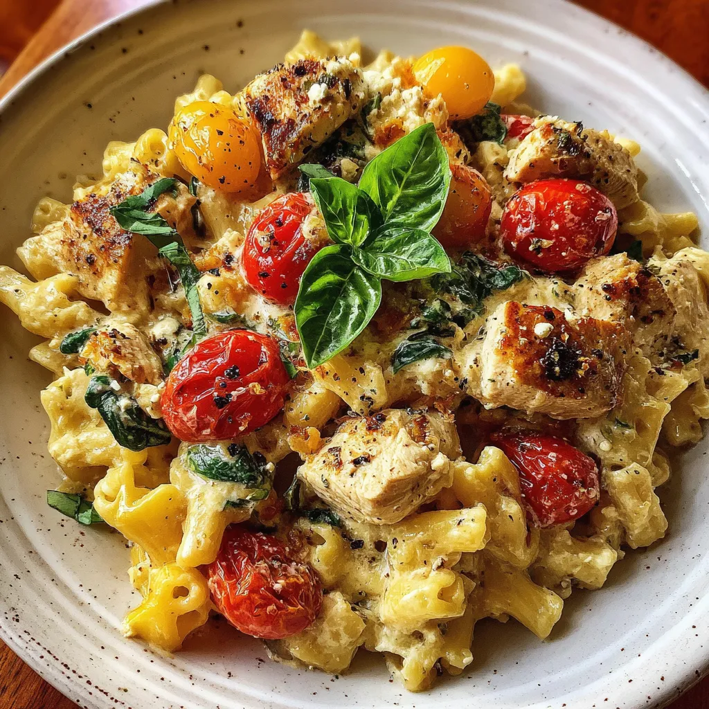 Juicy chicken bites and fresh spinach mingle with a creamy feta-infused sauce, roasted cherry tomatoes, and garlic notes coating al dente pasta. Each forkful offers a luscious, tangy burst.