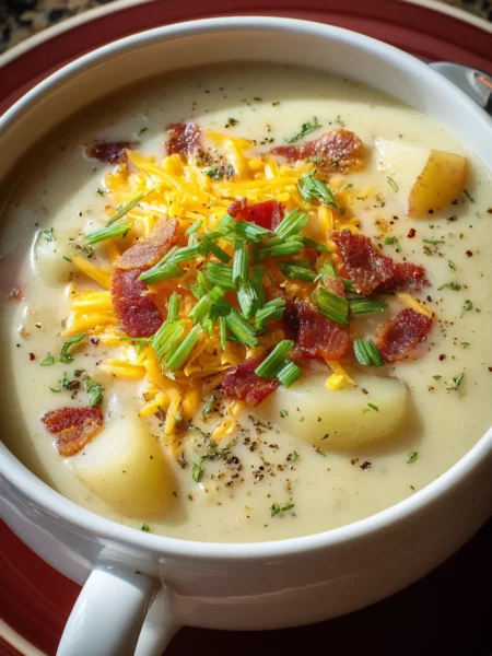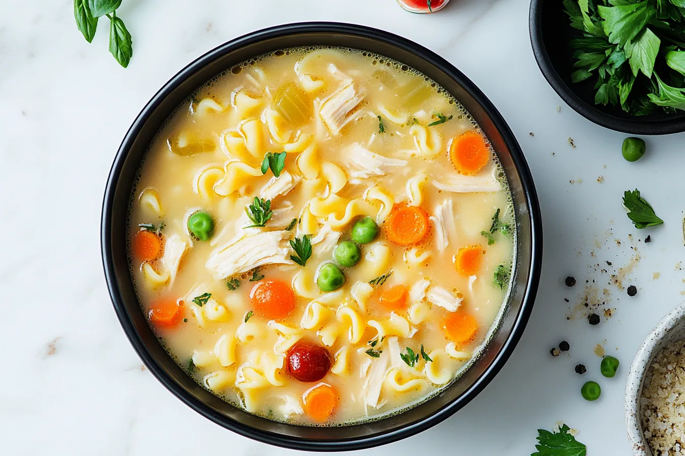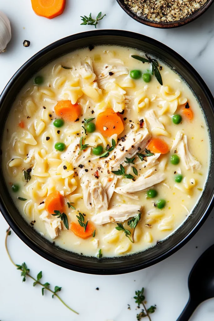 A comforting bowl of creamy chicken pasta soup, where tender chicken, al dente pasta, and a rich, velvety broth come together in perfect harmony. With hints of garlic, herbs, and a touch of cheese, it’s the ultimate cozy meal for any occasion!