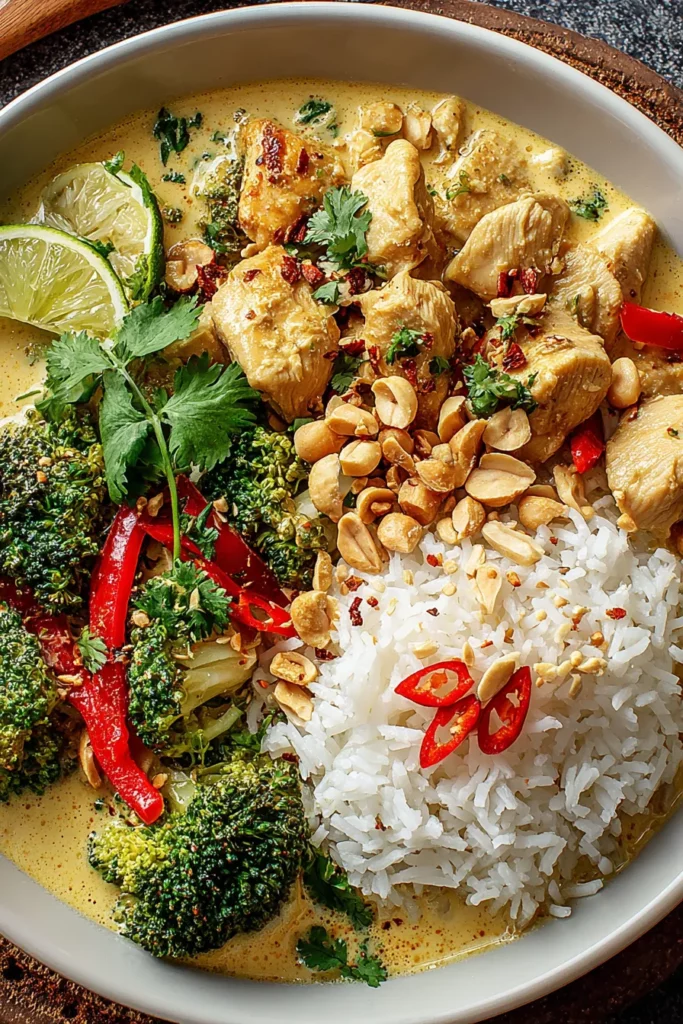 This creamy coconut chicken rice bowl combines tender chicken, vibrant veggies, and aromatic jasmine rice, all enveloped in a rich coconut sauce that transports your taste buds to paradise.