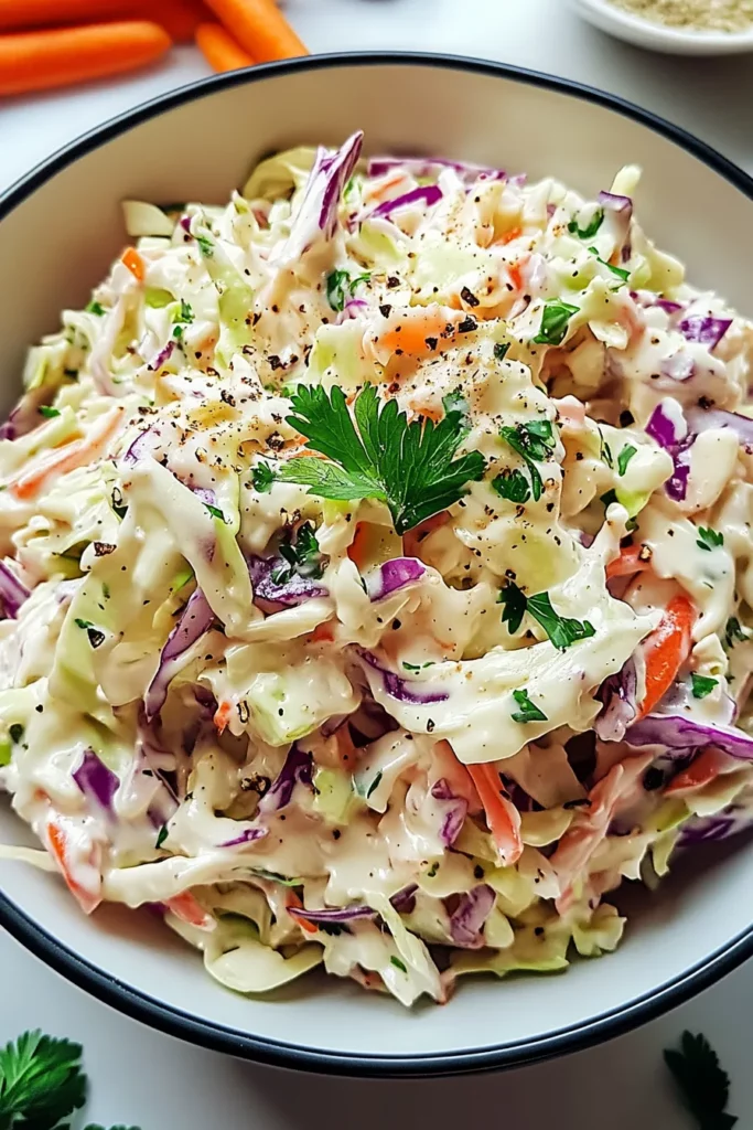 And there you have it—creamy coleslaw made simple! From the perfect balance of crunchy cabbage and sweet carrots to that tangy, creamy dressing that ties it all together, this dish is a guaranteed crowd-pleaser. Whether you’re serving it with BBQ, on top of a burger, or alongside fried foods, it’s a versatile side that’s always a hit.