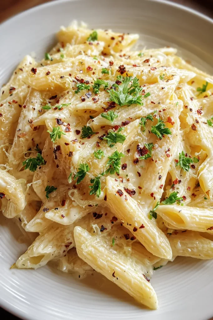This creamy garlic penne pasta is bursting with rich flavors, featuring tender pasta enveloped in a luscious, garlicky cream sauce, topped with parmesan and fresh parsley.