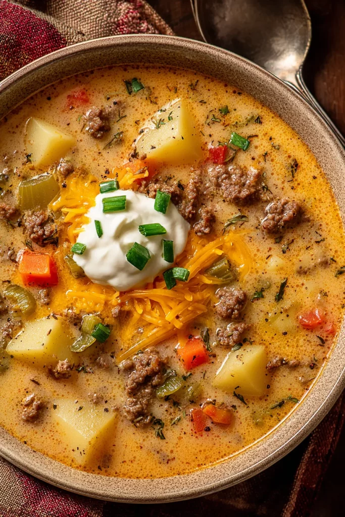 This rich and creamy soup blends savory ground beef, tender veggies, and melted cheddar cheese in a hearty broth. Perfect for cozy dinners!