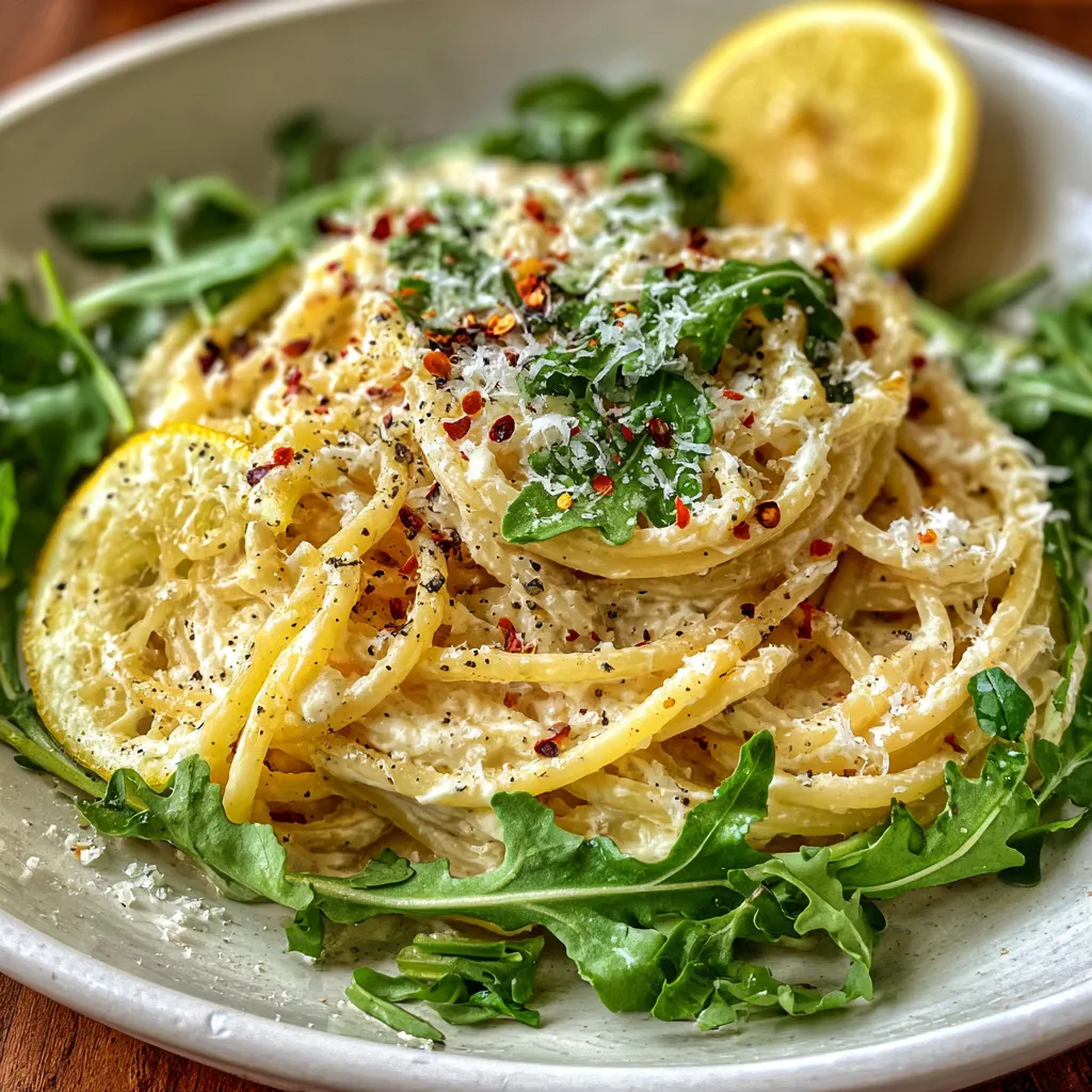 Tender spaghetti is coated in a silky ricotta sauce brightened with lemon zest and juice, then tossed with garlicky olive oil and peppery arugula for a fresh, creamy bite in every forkful.