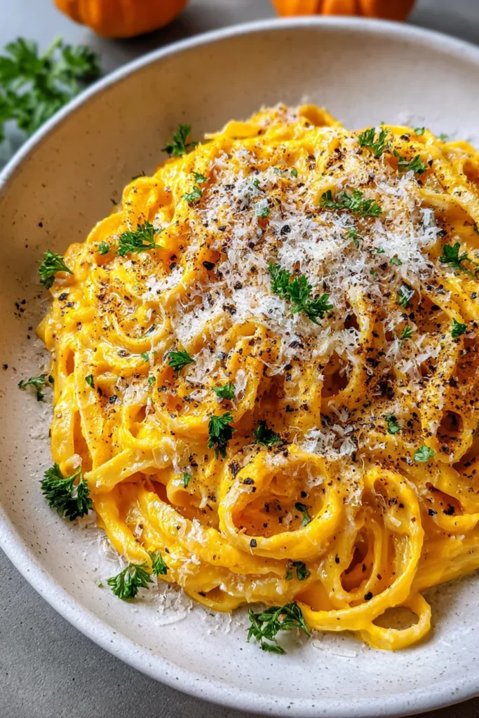 Creamy and rich, this pasta dish combines the sweet notes of roasted pumpkin with savory garlic and Parmesan. Perfect for cozy dinners, it’s both comforting and impressive.