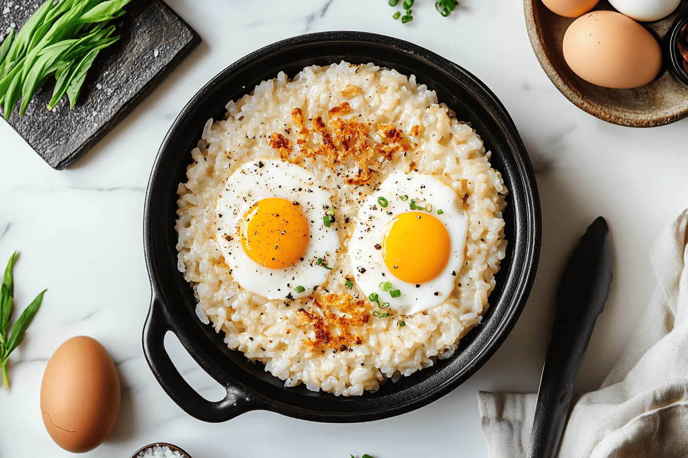 Imagine a plate of golden, crispy rice paired with two perfectly cooked eggs one with a velvety yolk and the other with a firm white. The crunch of the rice contrasts beautifully with the creamy eggs, creating a symphony of textures and flavors. A comforting and satisfying dish that will leave you craving more with every bite.