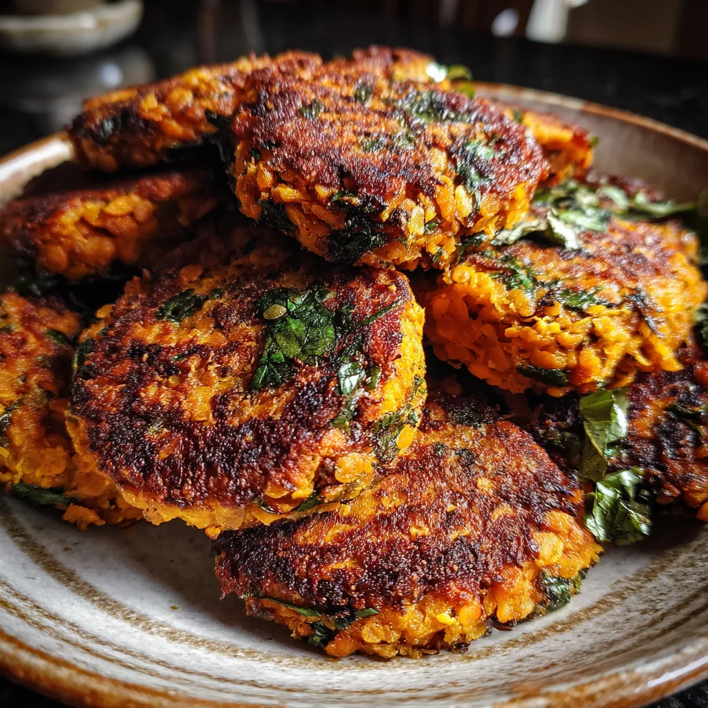 Golden-brown patties crisped to perfection hide a soft, spiced interior of sweet potatoes and red lentils. Fragrant hints of cumin, paprika, and fresh herbs give each bite a mouthwatering warmth.