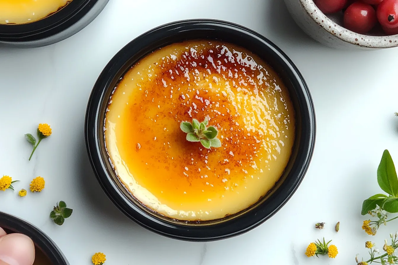 - STEP 11: When you’re ready to serve, sprinkle a thin, even layer of light brown sugar over the top of each custard. Use a kitchen torch to melt and caramelize the sugar until it forms a crisp, golden-brown shell. If you don’t have a torch, you can also place the ramekins under the broiler for a minute or two, but watch carefully to avoid burning the sugar.