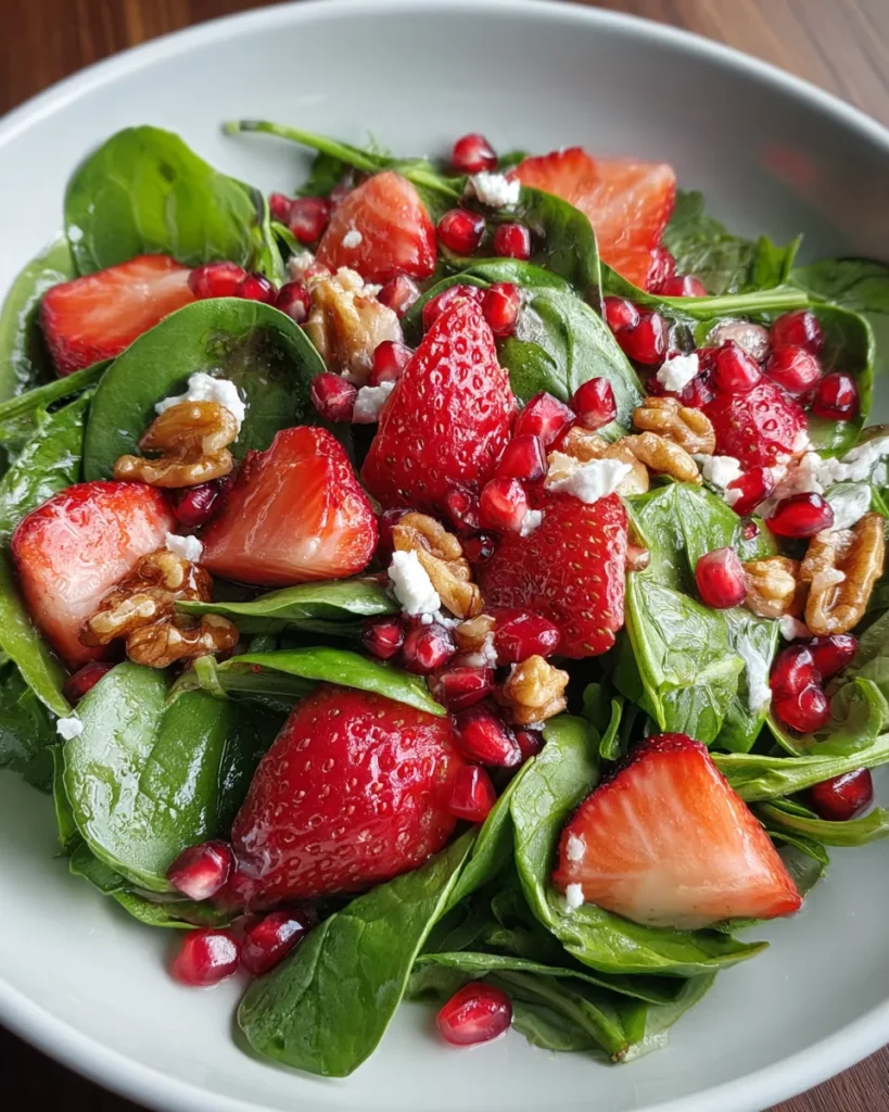 This salad isn’t just a visual feast—it’s also a symphony of tastes and aromas that dance between tangy, sweet, creamy, and crunchy. The creaminess of scattered feta cheese brings a delightful contrast to the snap of fresh walnuts, and everything is harmonized by a tangy balsamic vinaigrette that coats each ingredient with its silky sheen. It’s a refresher for the palate and a treat for the soul, effortlessly straddling the line between healthy and indulgent. Whether you’re looking for a light lunch, a starter to impress guests, or a vibrant dish to brighten up potlucks, this recipe fits the bill. Every time I serve it, I catch myself smiling—there’s something utterly infectious about its playful yet refined charm. So grab your bowl and let’s dive into the magic of this strawberry-pomegranate sensation!