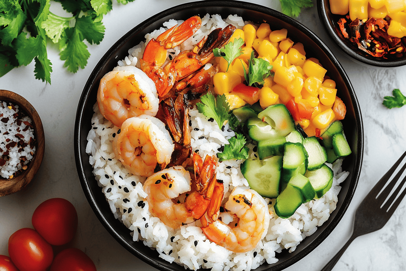 White Rice: Fluffy and light, white rice serves as the perfect base for this bowl, absorbing all the bold flavors and providing a comforting texture to complement the shrimp.