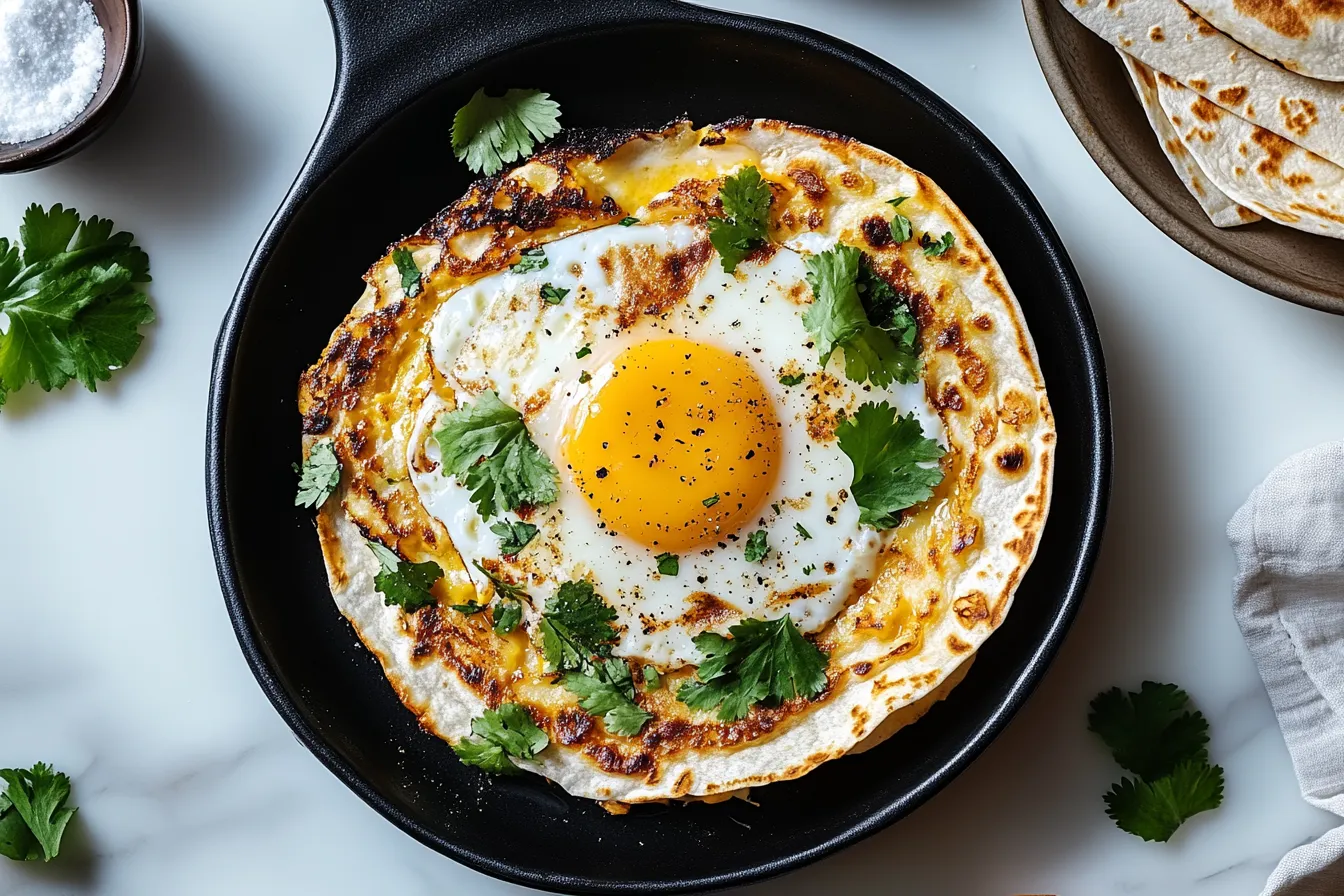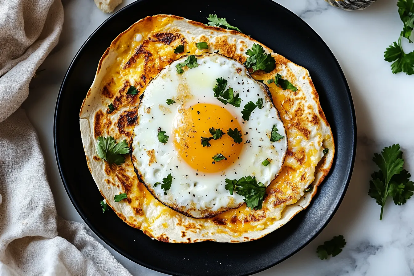 A crispy, golden quesadilla stuffed with a perfectly fried egg, melting cheese, and a hint of seasoning. The soft yolk breaks open with each bite, adding a rich, creamy texture to the crunchy, savory goodness. Simply irresistible!