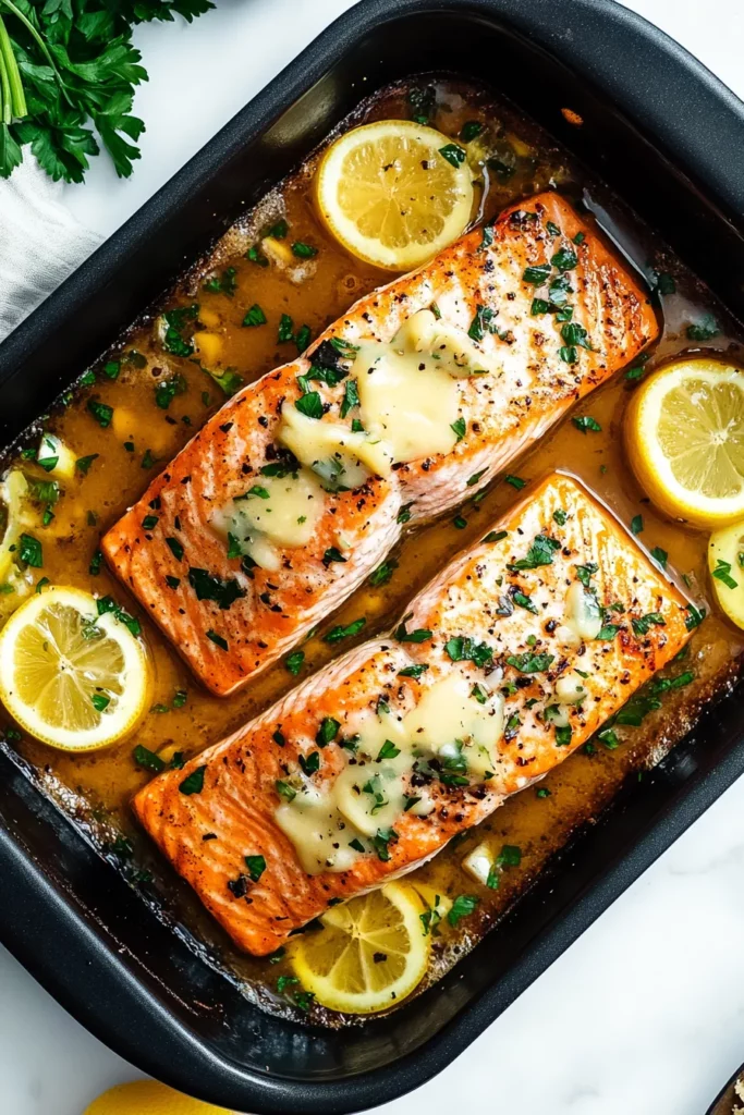 Experience tender salmon fillets bathed in golden garlic butter, zesty lemon, and fresh herbs, creating a mouthwatering dish that promises to impress everyone at your table.
