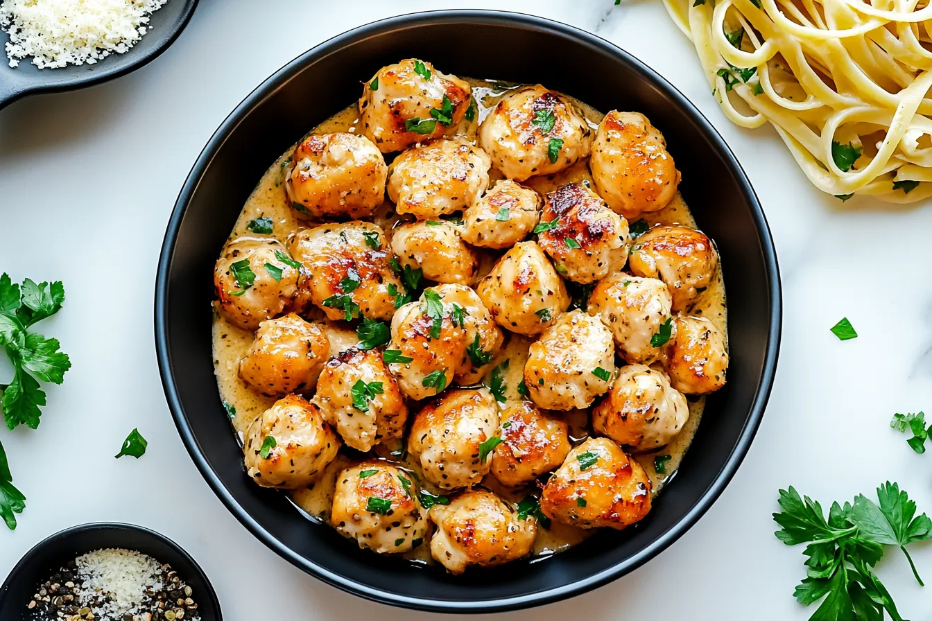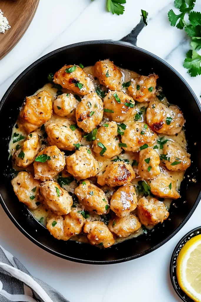 Tender, juicy chicken bites smothered in rich garlic butter, perfectly paired with velvety, creamy Parmesan pasta. The savory flavors come together in every bite, offering a comforting, satisfying meal that’s hard to resist!