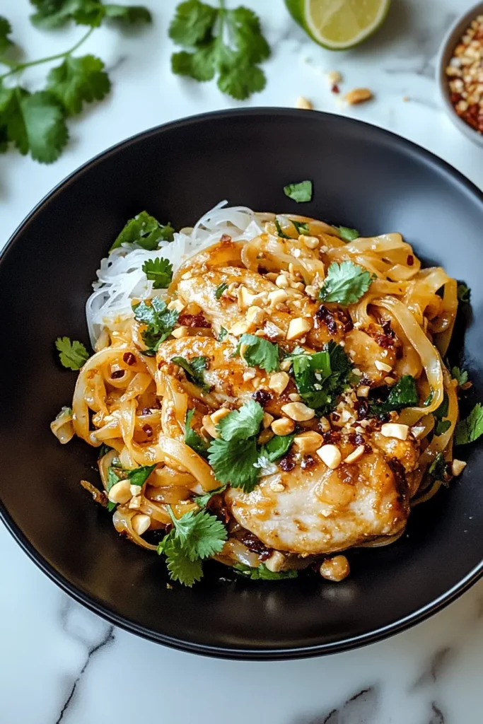 Garlic Butter Chicken Pad Thai is a savory fusion of tender chicken, perfectly stir-fried noodles, and a rich garlic butter sauce. Topped with fresh cilantro, crunchy peanuts, and a squeeze of lime, it’s a mouthwatering combination of creamy, zesty, and umami flavors.