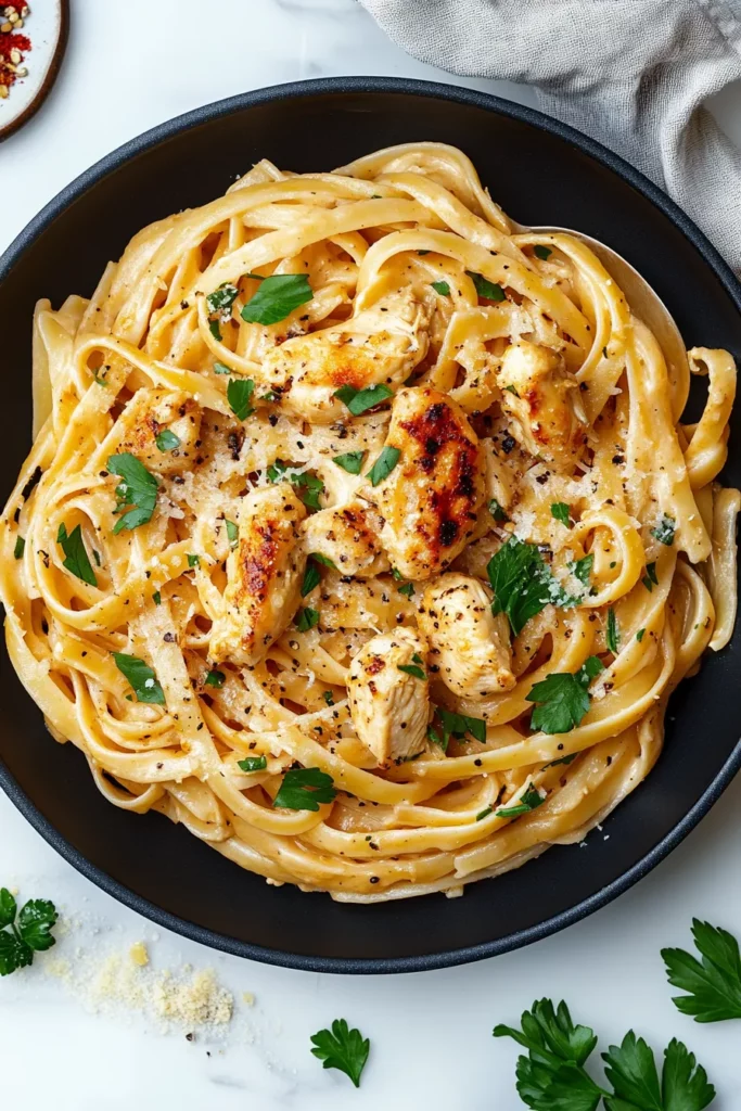 Tender chicken, perfectly cooked pasta, and a rich, creamy garlic butter sauce that wraps every bite in savory goodness. This dish is a comforting blend of flavors, with a hint of garlic and a touch of warmth that feels like a hug in a bowl!