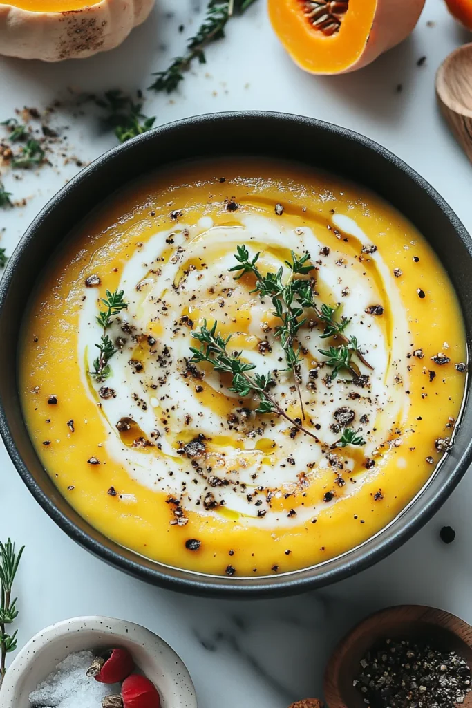 A pinch of nutmeg enhances the soup’s richness, adding a warm, slightly sweet, and nutty undertone that perfectly complements the squash.