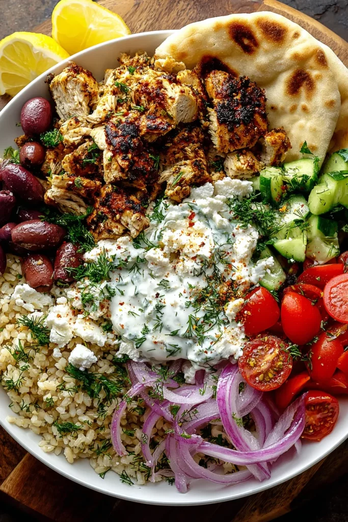 - Family-Style Platter: Arrange all the components—grains, sliced chicken, veggies, yogurt sauce, pita wedges—on a large wooden board. Let everyone assemble their own bowls for a fun, interactive meal.