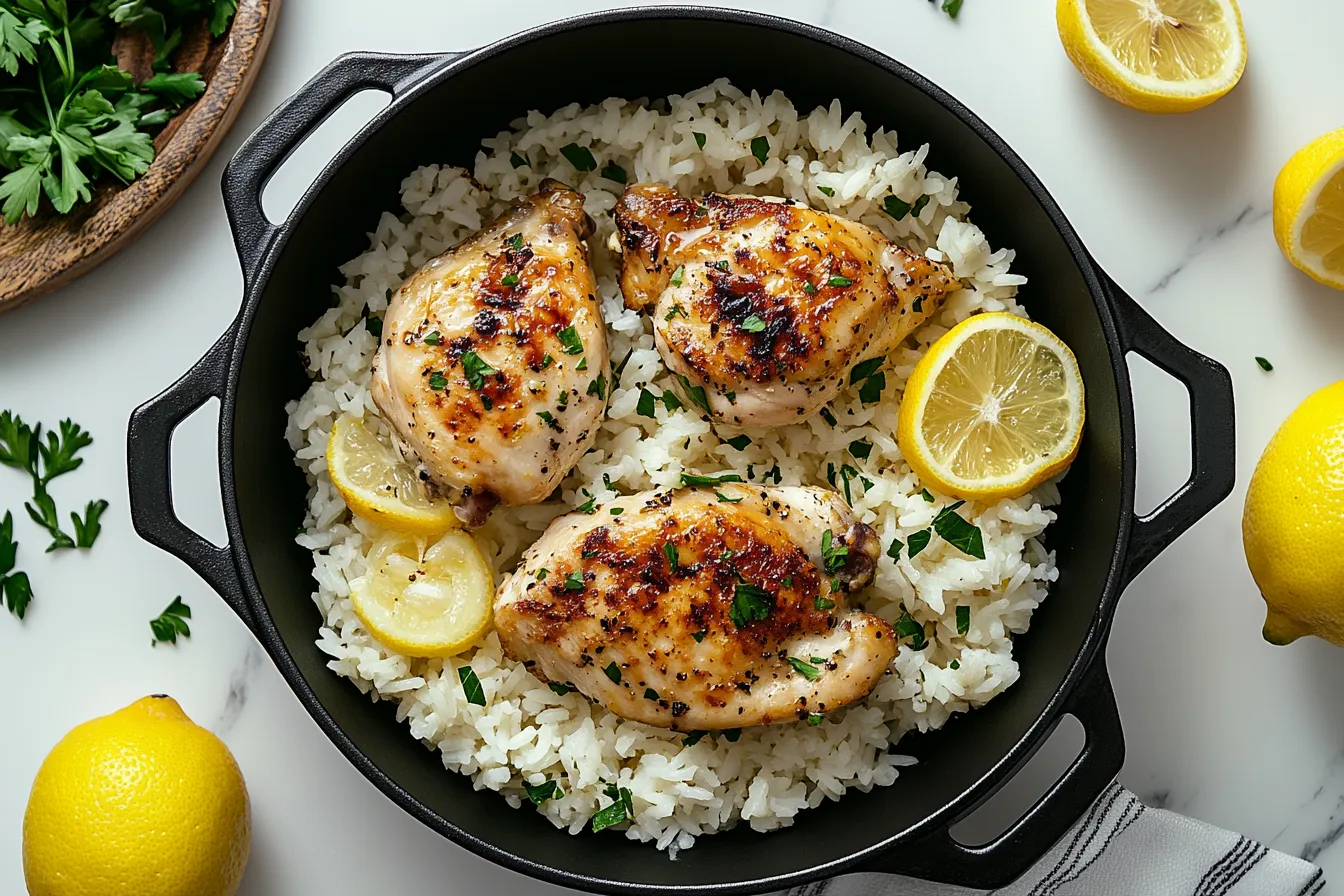 Basmati or long-grain white rice works beautifully here, as it absorbs the marinade’s flavor and cooks up light and fluffy. As the rice simmers in the juices from the chicken, it becomes a flavorful part of the dish rather than just a side. The rice soaks up the garlicky, lemony marinade, turning each bite into a savory, tangy delight.