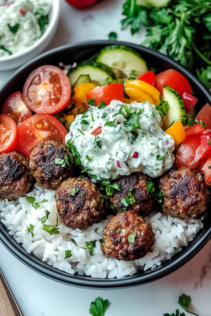 A vibrant Greek-inspired bowl featuring tender, juicy meatballs packed with herbs and spices, served over fluffy rice. Topped with creamy tzatziki, crisp fresh veggies, and a drizzle of olive oil, it's a refreshing, flavorful bite in every spoonful!