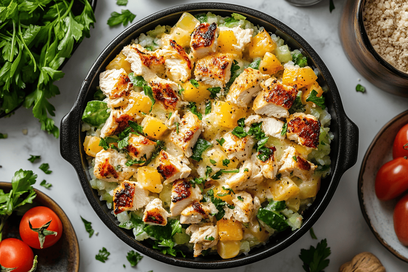 3. Lunch Bowl Bliss: Transform your Hawaiian chicken salad into a hearty lunch bowl by layering it on a bed of cooked quinoa or brown rice. Top it off with creamy avocado slices, a drizzle of sriracha mayo for a touch of heat, and a sprinkle of chopped cilantro for a burst of freshness. This wholesome and satisfying meal-in-a-bowl is not only a feast for the eyes but also a delightful medley of textures and flavors that will keep you energized and satisfied throughout the day.