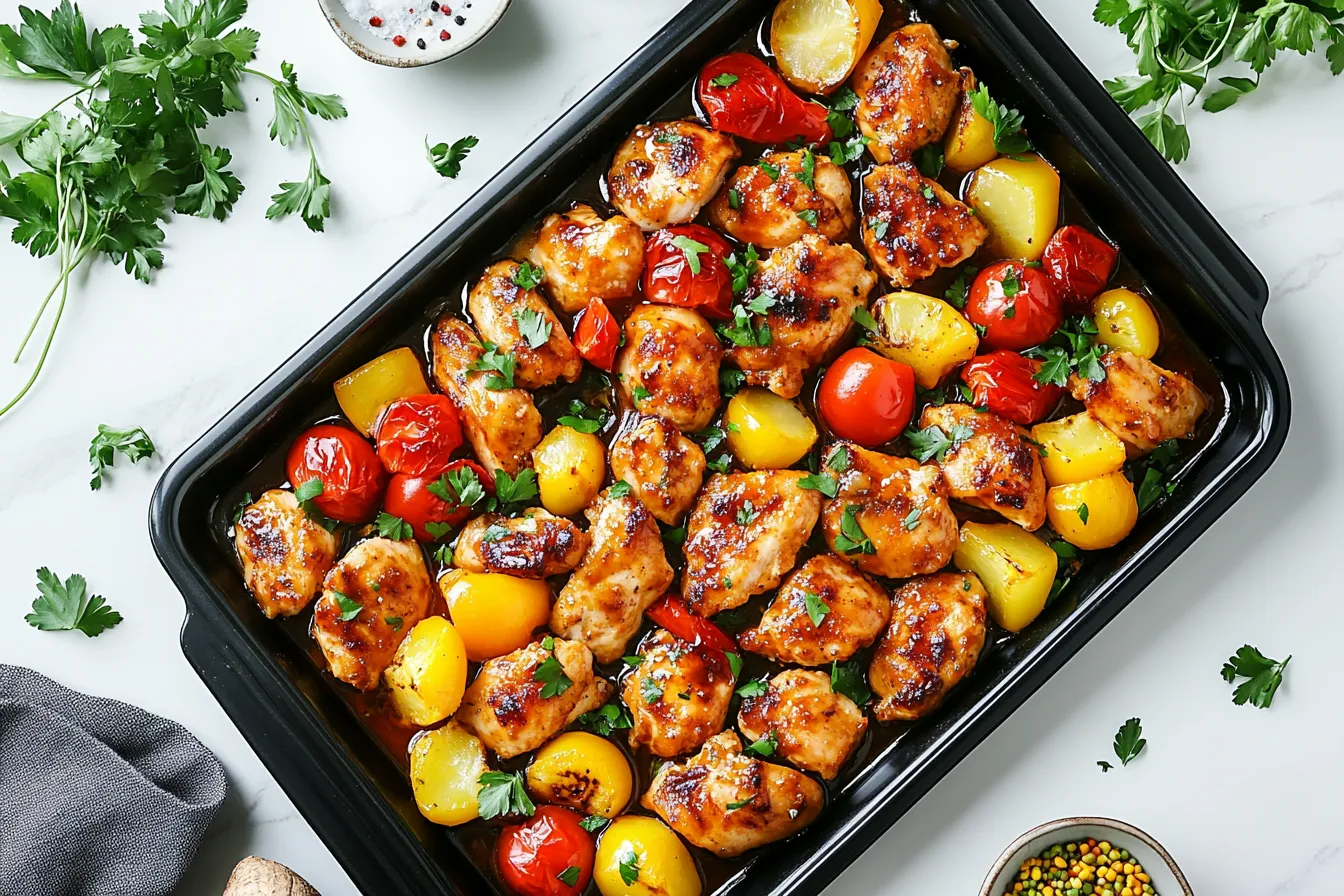 The sweet and tangy glaze on the chicken is what really makes this Hawaiian Chicken Sheet Pan dinner stand out. It’s a perfect balance of pineapple juice, soy sauce, and a touch of brown sugar, which caramelizes beautifully as the chicken roasts. I love how it coats each bite, adding a juicy burst of flavor without being overly sweet. Every time I make this, the kitchen fills with such a mouthwatering aroma, it’s hard to resist sneaking a taste while it’s still in the oven! The bell peppers and onions soak up all that delicious glaze too, turning into the perfect soft, slightly charred bites that complement the chicken so well.