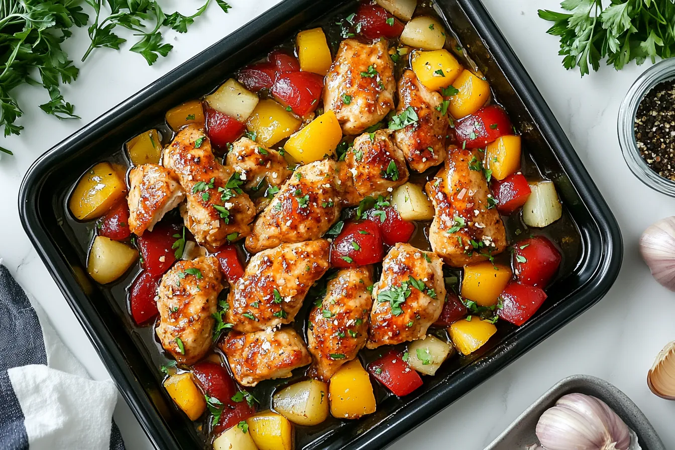 Tender chicken, roasted to perfection with sweet pineapple, bell peppers, and savory onions, all glazed in a tangy BBQ sauce. This one-pan meal bursts with tropical flavors, offering a simple yet irresistible taste of the islands!