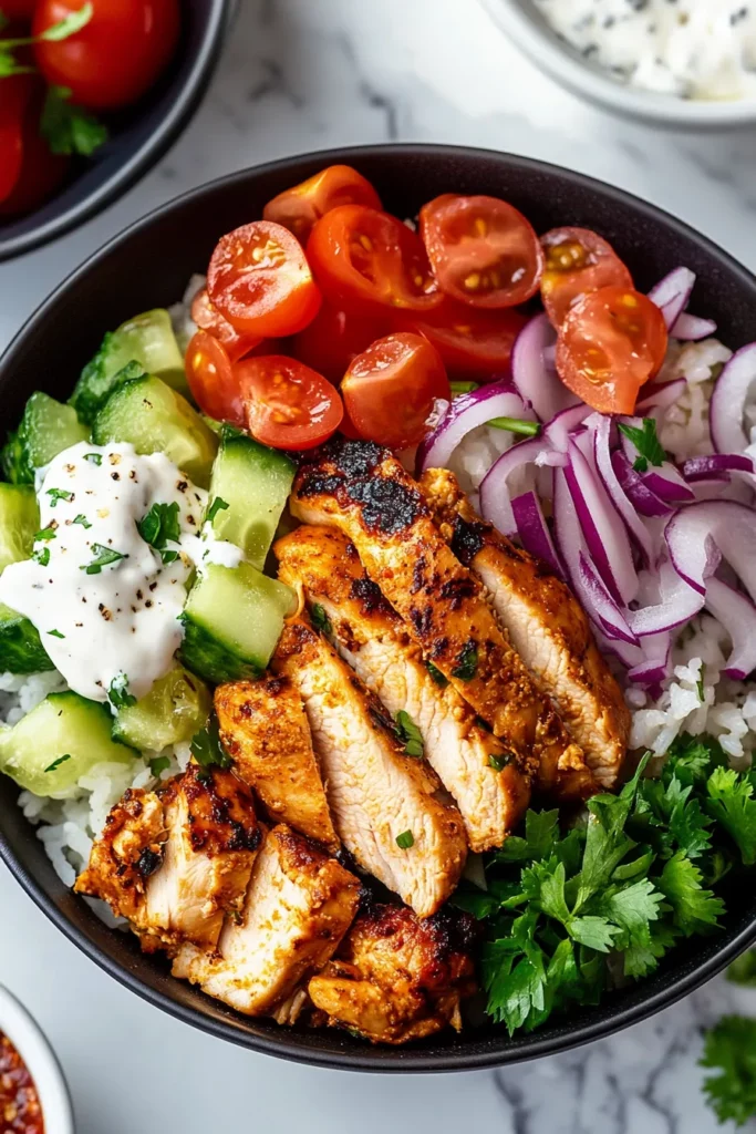 A vibrant, wholesome bowl featuring tender grilled chicken shawarma, fresh veggies, and a creamy, tangy yogurt sauce. Each bite bursts with aromatic spices, bringing a perfect balance of savory, zesty, and refreshing flavors. It’s a healthy, satisfying feast!