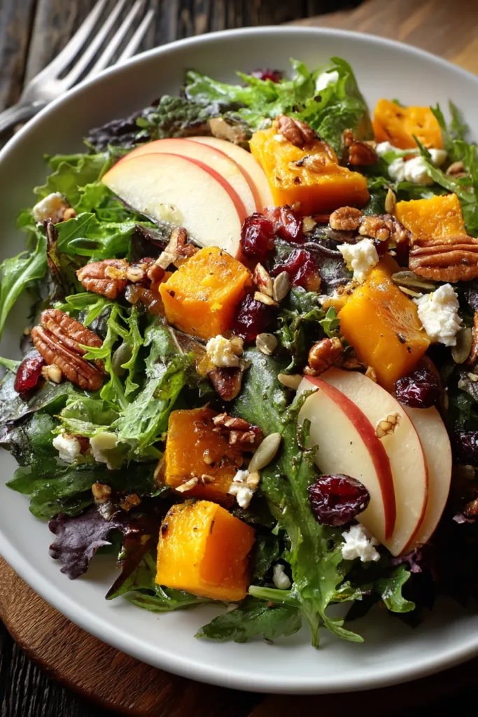 This Healthy Fall Salad combines fresh greens, roasted butternut squash, sweet apples, and crunchy pecans. Tossed with tangy balsamic vinaigrette for a delightful autumn crunch.