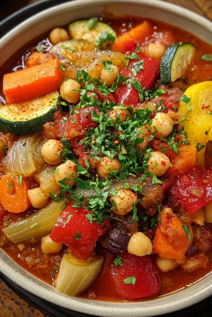 This hearty Mediterranean vegetarian stew bursts with vibrant veggies and aromatic spices, creating a warm, wholesome dish that nourishes both body and soul.
