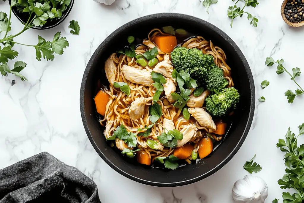 - STEP 9: Add the cooked lo mein noodles to the skillet. Using tongs, gently toss the noodles with the chicken and vegetables, ensuring they are well combined and coated with the flavorful sauce.