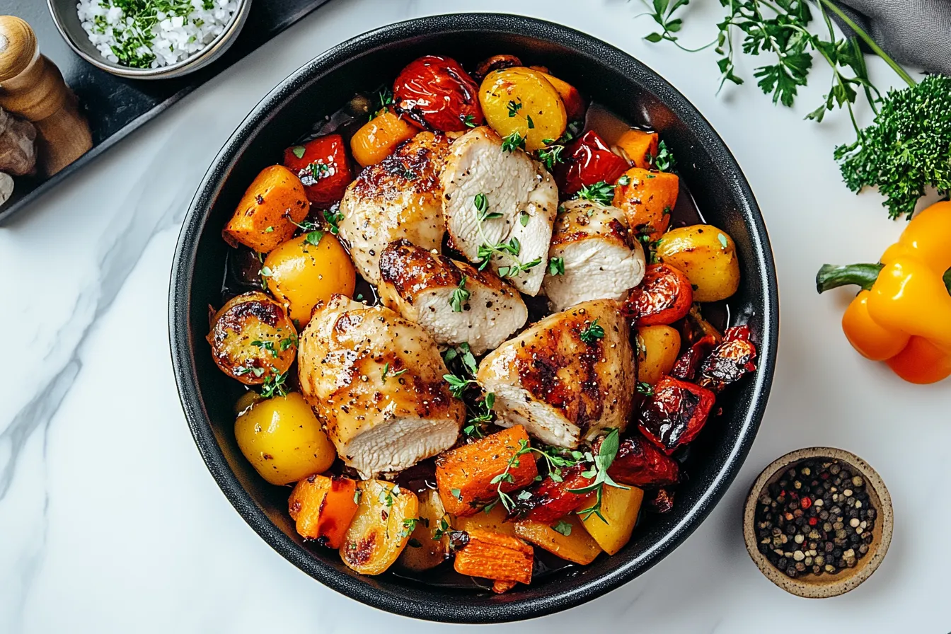 And there you have it—a deliciously comforting dish that brings together the perfect balance of flavors with the honey mustard glazed chicken and roasted vegetables. From the crispy, golden-brown chicken to the tender, caramelized veggies, this meal is bound to become a family favorite. Whether you’re serving it with a fresh salad, a hearty grain, or a drizzle of balsamic reduction, you’re sure to impress everyone at the table.