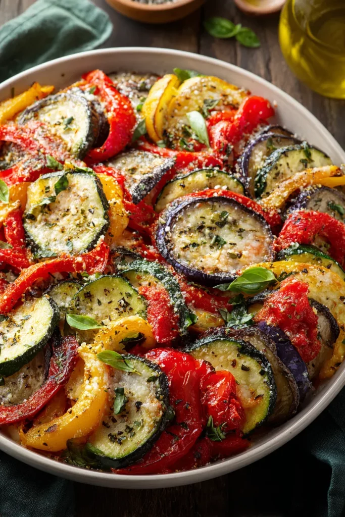 A colorful medley of eggplant, zucchini, and bell peppers smothered in melty cheese and herbs, this Italian-style vegetable bake is bursting with flavor and warmth.